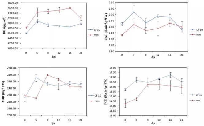 圖2 C. fulvum侵染后ROS含量和CAT、SOD、POD活性的變化