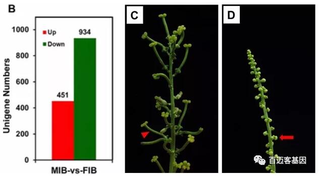 使用6-BA處理后成功誘導(dǎo)出雌性花序,F(xiàn)IB和MIB分別得到52876984和51201412條clean read(90bp),66723和67019條unigene,平均長度為775bp和750bp,約78.45%的基因得到注釋。篩選條件為FDR<=0.001和log2(FC)>=1,得到1385個(gè)差異基因,F(xiàn)IB相比于MIB,有451個(gè)基因上調(diào),934個(gè)基因下調(diào)。