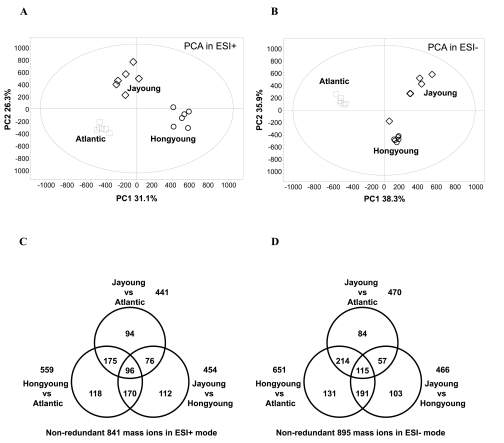 對三種不同色澤馬鈴薯樣本進(jìn)行主成分分析,結(jié)果顯示不同品種馬鈴薯代謝物差異顯著。代謝組檢測表明,在正離子模式下,共檢測出841個(gè)信號(hào)離子,其中Hongyoung和Atlantic共有559個(gè)信號(hào)離子,Jayoung 和Atlantic 共有441個(gè)信號(hào)離子,Jayoung 和Hongyoung 共有 454 個(gè)信號(hào)離子;在負(fù)離子模式下,共檢測出895個(gè)信號(hào)離子,其中Hongyoung 和 Atlantic共有 651 個(gè)信號(hào)離子,Jayoung 和Atlantic 共有470個(gè)信號(hào)離子,Jayoung和Hongyoung共有 466 個(gè)信號(hào)離子。
