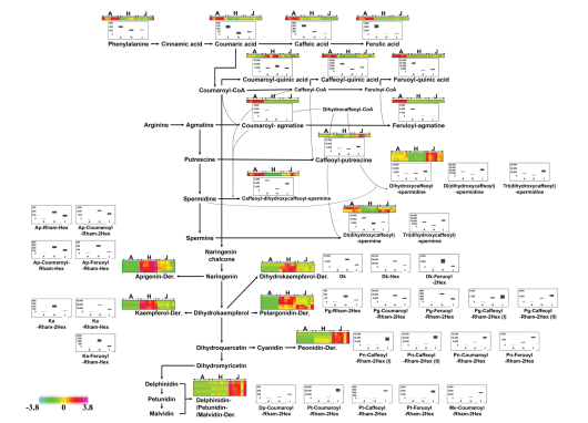 花青素是苯丙素通路中類黃酮合成的花色素苷的酰基糖苷。據(jù)報(bào)道,花青素衍生物飛燕草色素(Dp),芍藥色素(Pn)和錦葵色素(Mv)是紫色和深色的色素來源,而花青色素(Cy)和花葵素(Pg)的衍生物是亮紅色果實(shí)中的主要色素。結(jié)果顯示,Hongyoung與Jayoung在苯丙素合成途徑下游的黃酮類組分差異顯著,表明這些代謝物可能是造成馬鈴薯品種間色澤差異的關(guān)鍵因素。Hongyoung中芹黃素、山柰酚、二氫山柰酚和天竺葵色素衍生物的含量較高,而Jayoung中芍藥花青素、牽牛花色素、飛燕草色素和錦葵色素衍生物積累較多。