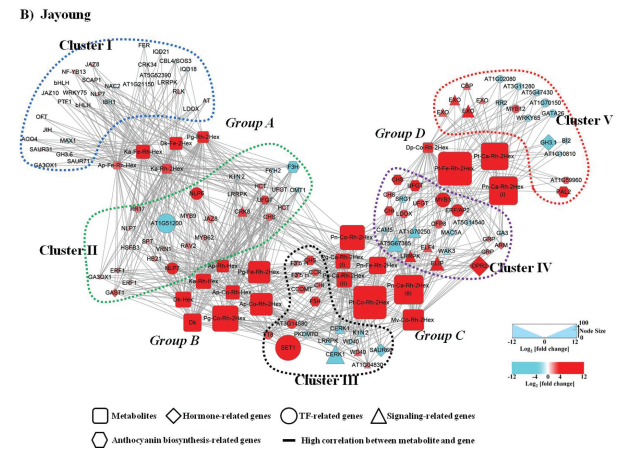 對 22 個(gè)花青素衍生物和 167 個(gè)基因(三個(gè)馬鈴薯品種中類黃酮代謝、植物激素、信號(hào)通路、轉(zhuǎn)錄因子相關(guān)的差異表達(dá)基因)相關(guān)性分析,發(fā)現(xiàn)有 119 個(gè)基因與這 22 個(gè)花青素衍生物相關(guān)性極高(相關(guān)系數(shù)>0.9)。在 Hongyoung 和 Jayoung 中對相關(guān)性高的 119 個(gè)基因和22個(gè)代謝物做共表達(dá)網(wǎng)絡(luò)分析,把119個(gè)基因參與的調(diào)控網(wǎng)絡(luò)聚為5組(ClusterI-V),22 個(gè)花青素衍生物參與的代謝通路分為 4 組 (Group A-D) 。