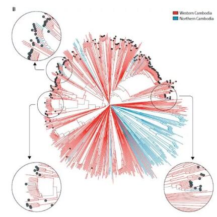 研究人員通過對來自于東南亞的1492例惡性瘧原蟲樣本的基因組序列數(shù)據(jù)分析,其中包括2007至2013年間在柬埔寨西部收集的464個惡性瘧原蟲樣本,耐藥性的不同流行病學起源通過對Kelch13青蒿素耐藥基因座和plasmepsin 2-3 哌喹耐藥基因座的單倍型分析進行鑒別。最終確定了30多個獨立的青蒿素耐藥性起源,其中91%為KEL1譜系(140/154)為耐受雙氫青蒿素哌喹抗性的寄生蟲。2008年,KEL1譜系和與哌喹抗性相關PLA1譜系相結(jié)合。2013年,KEL1/PLA1 結(jié)合譜系在柬埔寨西部頻率達到63%(24/38),并已蔓延至柬埔寨北部。