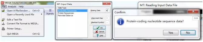 File — Open A File/Session — 選擇要導(dǎo)入的文件,選擇數(shù)據(jù)類型(如果是SNP即為Nuceotide Sequences),提示Protein-coding nucleotide sequence data時(shí),選擇No,即不把DNA序列翻譯成蛋白序列構(gòu)建進(jìn)化樹,如圖5。