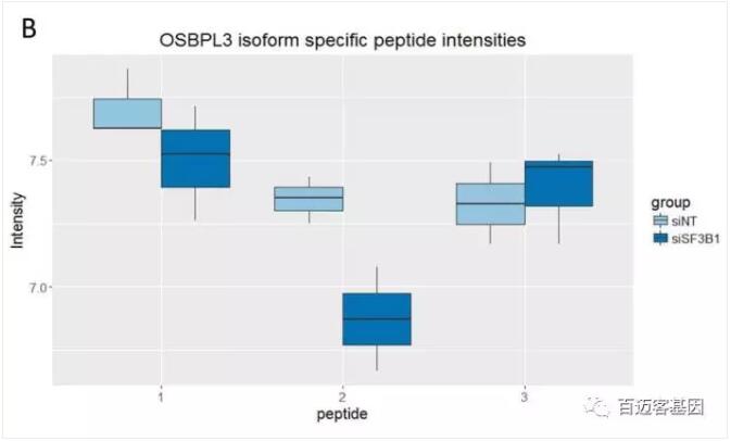約65%的顯著差異表達的splice-specific-peptides在RNA水平上表現(xiàn)出一致的表達差異。例如,下調(diào)SF3B1的實驗組中,OSBPL3 9號外顯子中分別有3個支持外顯子保留和1個支持外顯子去除的peptides被鑒定出來。兩種inclusion specific-peptides表達明顯較低,而exclusion specific -peptides則與對照相比表現(xiàn)出較高的表達量(如圖5所示)。