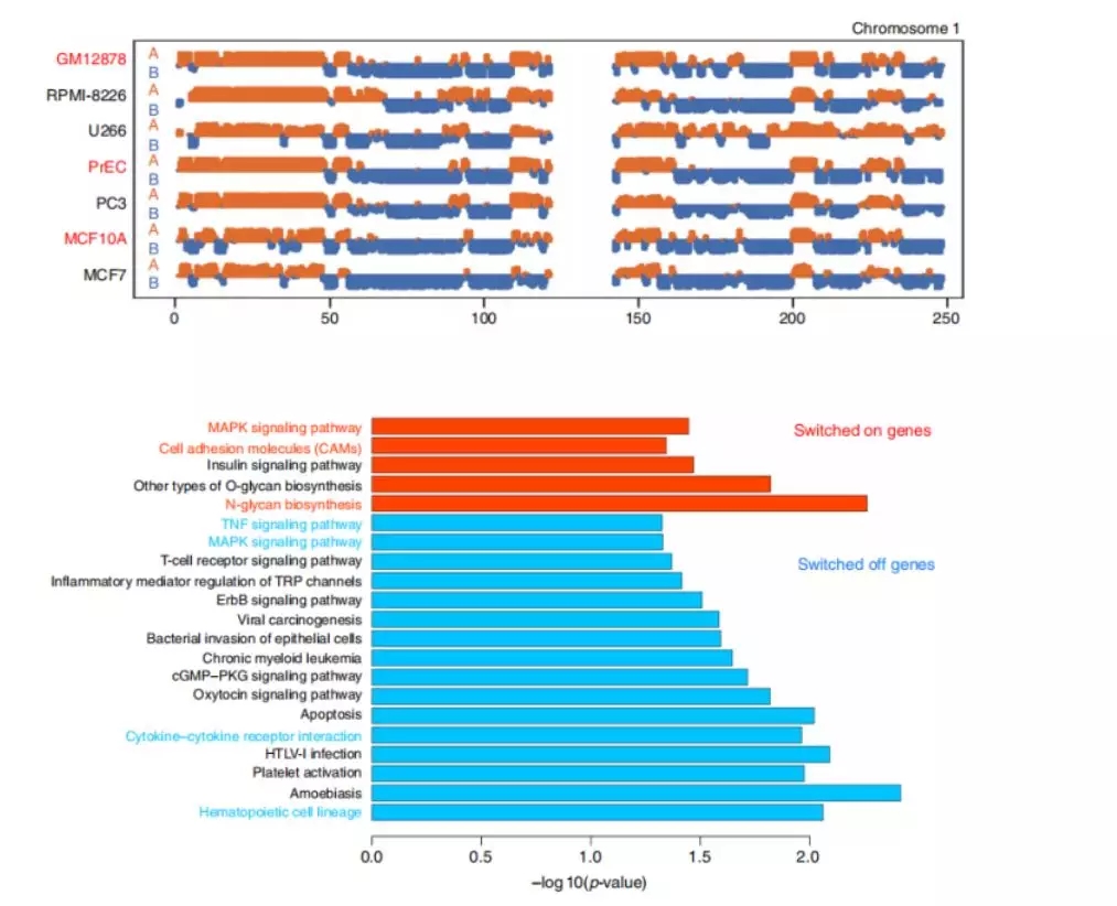 例如在人的多發(fā)性骨髓瘤文章中,作者利用正常B細胞(GM12878)和兩種亞型的骨髓瘤細胞(近二倍體U266和近三倍體RPMI-8226)進行Hi-C、WGS和RNA-seq測序,結果發(fā)現(xiàn),相比于GM12878,U266和RPMI-8226癌癥細胞中6%的區(qū)域均存在B轉換到A,1%的區(qū)域均存在A轉換到B,結合RNA-seq數(shù)據(jù),發(fā)現(xiàn)B轉換到A區(qū)域內的基因變成轉錄活躍狀態(tài),而A轉換到B區(qū)域內的基因變成轉錄抑制狀態(tài),KEGG富集通路發(fā)現(xiàn)這些基因與多發(fā)性骨髓瘤相關,主要涉及MAPK信號轉導途徑、TNF信號轉導途徑、細胞因子和細胞因子受體相互作用途徑等,進一步在染色體2q11.2-q12.142處發(fā)現(xiàn)一個細胞因子基因簇,幾種白細胞介素IL1R1,IL1R2,IL18R1和細胞因子MAP4K4下調表達,這些基因在后續(xù)研究中重點關注。