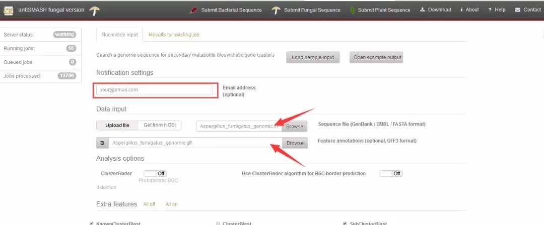 1.次級代謝產(chǎn)物預(yù)測網(wǎng)址:https://fungismash.secondarymetabolites.org ,點擊進入界面,可進行細菌、真菌以及植物次級代謝產(chǎn)物預(yù)測;