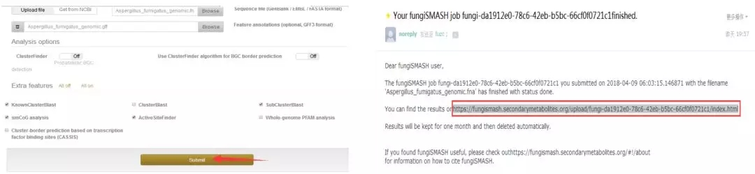 3.其他參數(shù)默認,點擊“submit”申請次級代謝產(chǎn)物預(yù)測結(jié)果,大約12h內(nèi),系統(tǒng)運行結(jié)束后,預(yù)留郵件會收到預(yù)測結(jié)果;