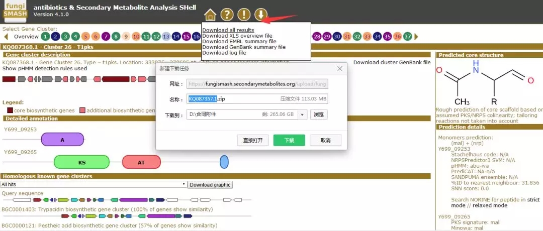 4.進入預(yù)留郵箱查看預(yù)測結(jié)果,打開預(yù)測結(jié)果網(wǎng)址即可查看結(jié)果,包含基因簇序列編號,次級代謝產(chǎn)物類型,基因簇所在位置,與已知次級代謝基因簇的結(jié)果比對等;