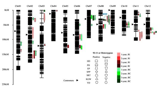 研究人員對(duì)多個(gè)雜交水稻組合的產(chǎn)量?jī)?yōu)勢(shì)性狀進(jìn)行多年、多地點(diǎn)的綜合分析發(fā)現(xiàn):每穗小花數(shù)和有效穗數(shù)是造成兩系雜交稻產(chǎn)量?jī)?yōu)勢(shì)的主要原因,而且前者有超親優(yōu)勢(shì),后者只有超父本優(yōu)勢(shì)。之后對(duì)源自LYP9后代的每個(gè)重組自交系(RIL)群體進(jìn)行重測(cè)序的基礎(chǔ)上,構(gòu)建了一張高分辨率的遺傳連鎖圖,并利用RIL群體及其與母本回交的RILBC1群體進(jìn)行產(chǎn)量相關(guān)性狀的遺傳定位,鑒定了一系列產(chǎn)量及其他優(yōu)勢(shì)相關(guān)性狀的QTL位點(diǎn)。同時(shí),結(jié)合對(duì)幼穗發(fā)育早期的轉(zhuǎn)錄組分析以及QTL定位的結(jié)果,確定了多個(gè)與雜種優(yōu)勢(shì)相關(guān)候選基因。此外,還對(duì)一個(gè)產(chǎn)量雜種優(yōu)勢(shì)的主效位點(diǎn)進(jìn)行了圖位克隆,發(fā)現(xiàn)rice heterosis 8 (RH8) 位點(diǎn)實(shí)際上是由DTH8/Ghd8/LHD1編碼的光周期調(diào)控的節(jié)律基因,它同時(shí)控制開花期、株高、分蘗數(shù),每穗小花數(shù)等多種性狀。隨后對(duì)361份雜交稻(其中包括125份二系雜交稻)的基因型解析后發(fā)現(xiàn),RH8的雜合性是兩系法雜交稻基因型的主要類型。