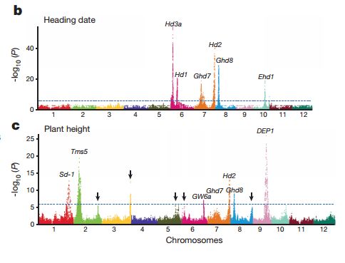 作者通過(guò)對(duì)1495份雜交稻品種材料中17套代表性雜交稻產(chǎn)生的10074 F2遺傳群體進(jìn)行基因組測(cè)序和田間產(chǎn)量性狀考察,綜合QTL定位及GWAS分析,鑒定出了控制水稻雜種優(yōu)勢(shì)的主要基因位點(diǎn)HD3a、TAC1、LAX1、Ghd8等 。進(jìn)一步研究表明,水稻中雜種優(yōu)勢(shì)的表現(xiàn)正是由這些基因位點(diǎn)所決定,在雜交配組中,這些基因位點(diǎn)產(chǎn)生了全新的基因型組合,在雜交一代中高效地實(shí)現(xiàn)了對(duì)水稻花期、株型、產(chǎn)量各要素的理想搭配。