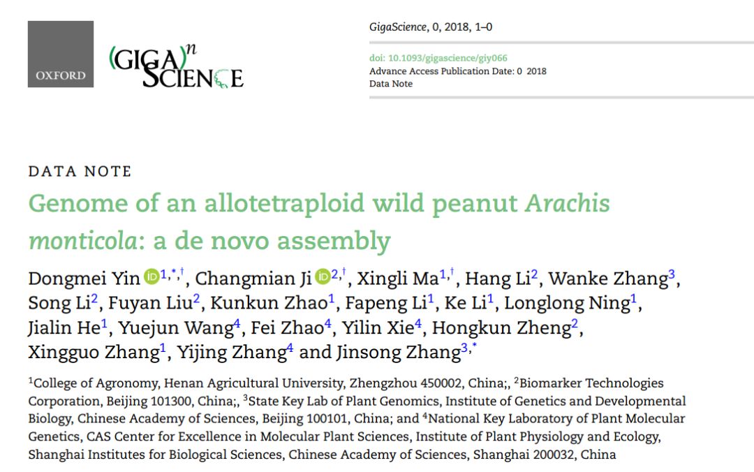 花生作為我國重要的經(jīng)濟作物,廣泛種植于熱帶和亞熱帶地區(qū),是提供重要的蛋白和油料的基礎(chǔ)。作為豆科的重要分支之一,花生屬一共包括30個二倍體品種,1個異源四倍體野生花生(A.monticola)和1個異源四倍體栽培花生(A.hypogaea)(2n = 4x = 40)。作為栽培花生農(nóng)藝性狀改良的重要野生資源供體,野生四倍體花生的基因組也一直是國內(nèi)外學者的研究熱點。成功破譯四倍體野生花生的基因組有助于科學家和育種專家對A.hypogaea起源及馴化過程的理解。河南農(nóng)業(yè)大學殷冬梅教授團隊與北京百邁客生物科技有限公司、中國科學院等多家單位聯(lián)合攻關(guān),成功破譯復雜的異源四倍體野生花生基因組密碼,相關(guān)成果于2018年6月19日發(fā)表在GigaScience上:“Genome of an allotetraploid wild peanut Arachis monticola: a de novo assemble”。