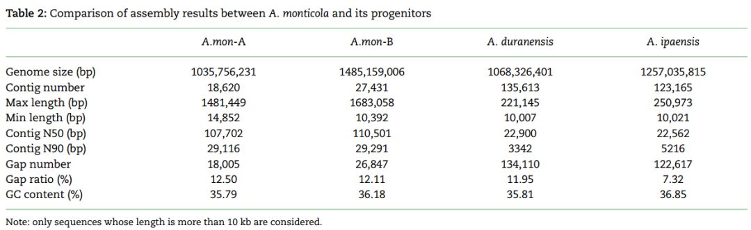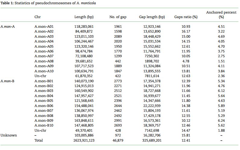 最終組裝出2.62Gb的基因組序列,保證組裝的完整性,又利用BioNano和Hi-C等方法對基因組進行區(qū)分最終A.monticola得到的subgenome與祖先A基因組A.duranensis、祖先B基因組A.ipaensis之間的比較如表2所示,野生花生A and B subgenomes與對應的基因組大小相近,基因組的完整性和連續(xù)性都有了顯著提升,為后續(xù)的功能基因組研究打下了堅實的基礎(chǔ)。
