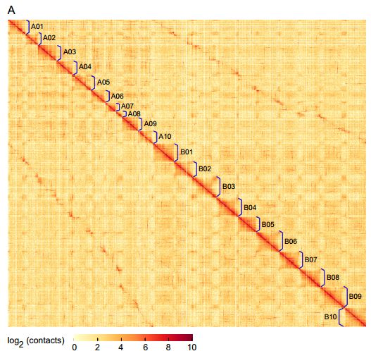 ????????除了常規(guī)基因組的評估手段之外,我們還利用更直觀的Hi-C對該基因組序列進行準確性評估,并與其祖先種A和祖先種B進行了比較。比較栽培種A.monticola得到的subgenome與祖先A基因組A.duranensis, 祖先B基因組A.ipaensis的Hi-C熱圖,整體熱圖一致性非常高。(A圖是A.monticola的HiC熱圖,B圖祖先A基因組A.duranensis, 祖先B基因組A.ipaensis的Hi-C熱圖)