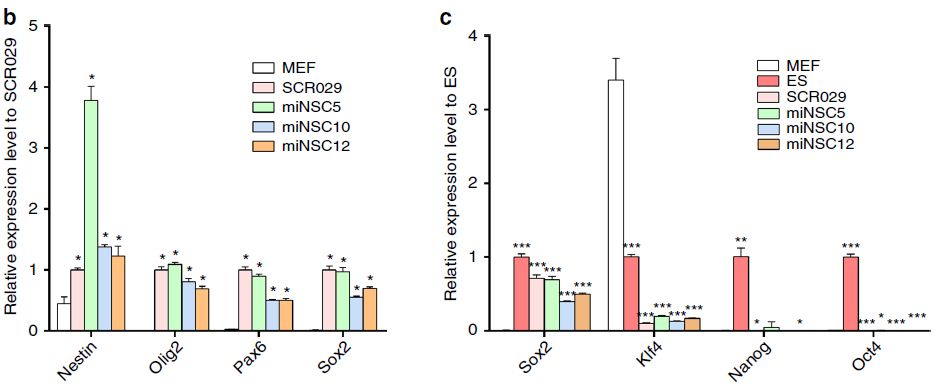 為了進一步確認這些miNSC的NSC身份,作者對miNSC10、SCR029和MEF細胞進行了RNA-seq分析。miNSC10、SCR029和MEF細胞中基因表達水平的散點圖顯示,miNSC10和SCR209細胞的基因表達水平相似,但均與MEF存在顯著差異(圖3a-c)。與這些結(jié)果一致的是,聚類分析也顯示出miNSC10和SCR029細胞之間有很高的相似性,但它們與MEF之間有很大的差異(圖3d)。與MEF相比,miNSC中有許多基因表達水平下調(diào)或上調(diào)(圖3e)。作者對上調(diào)基因進行基因集富集分析(GSEA),發(fā)現(xiàn)了兩組主要的富集基因GO term(圖3f)。其中一組在與神經(jīng)發(fā)育相關(guān)的GO term中富集,如神經(jīng)發(fā)生、神經(jīng)元分化、神經(jīng)系統(tǒng)發(fā)育、神經(jīng)發(fā)生調(diào)節(jié)、大腦發(fā)育和軸突發(fā)生。另一組富集在細胞分裂GO term,包括細胞分裂、有絲分裂細胞周期、核分裂、姐妹染色單體分離、細胞周期調(diào)控。這些數(shù)據(jù)與miNSC作為NSC及其增殖和自我更新能力是一致的。與此一致的是,進一步的分析顯示,盡管有一定的差異,但miNSC10、SCR029、NS528(小鼠ES細胞來源的NSC)和ciNSC10 (化學(xué)誘導(dǎo)MEF形成的NSC)細胞之間的相似性比MEF更大。