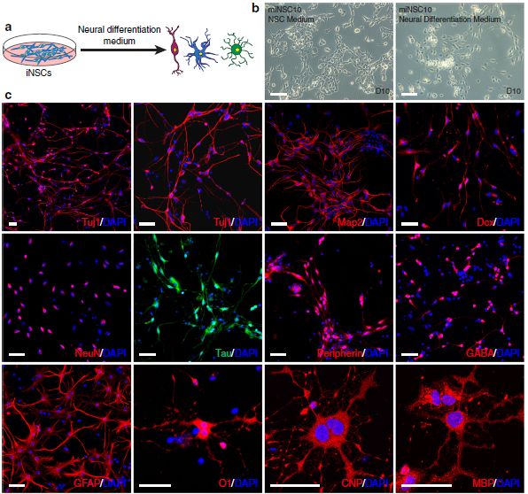 作者想要解決的問題是由非神經(jīng)前體細胞TF Ptf1a重編程的miNSC是否可以與NSC 一樣,具有分化成神經(jīng)元、星形膠質(zhì)細胞和少突膠質(zhì)細胞的潛力(圖4a)。當(dāng)在神經(jīng)分化培養(yǎng)基中培養(yǎng)時,短短幾天內(nèi),miNSC就發(fā)生了穩(wěn)健的形態(tài)學(xué)變化,細胞體積變小、普遍的神經(jīng)突擴張(圖4b)。在培養(yǎng)的2-3周,許多細胞分化為Tuj1、Map2、Dcx、NeuN、Tau、peripherin或GABA免疫的神經(jīng)元(圖4c)。3周時的定量顯示,83.3%的細胞呈Tuj1陽性(圖4e)。此外,不同miNSC細胞系(miNSC5、10、12)顯示類似的分化成Tuj1或Map2免疫的神經(jīng)元的能力(補充圖8)。在星形膠質(zhì)細胞分化條件下,87.2%的分化細胞形成神經(jīng)膠質(zhì)原纖維酸性蛋白(GFAP)免疫的星形膠質(zhì)細胞(圖4 c,e),少突膠質(zhì)細胞分化培養(yǎng)基中,miNSC能夠分化為O1、CNP或MBP免疫的少突膠質(zhì)細胞,而26.6%的分化細胞為O1陽性(圖4 c,e)。因此,ptf1a重編程的miNSC具有三能性,能夠分化為神經(jīng)元、星形膠質(zhì)細胞和少突膠質(zhì)細胞。