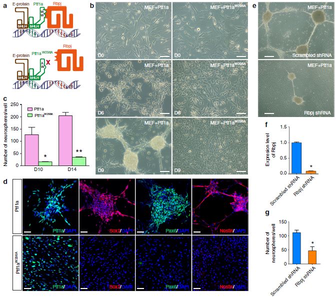 先前有研究表明,Ptf1a與Rbpj、E-蛋白以非Notch信號依賴性方式形成DNA結(jié)合三聚體,以特化胰腺細胞系和GABA能神經(jīng)元。作者研究了Ptf1a和Rbpj之間非Notch信號依賴性的互作是否也是Ptf1a重編程所需要的。在MEF中,WB和免疫共沉淀結(jié)果顯示,Rbpj蛋白是內(nèi)源性表達,外源性表達的Ptf1a可以免疫共沉淀Rbpj。將Dox可誘導(dǎo)的 Ptf1aW298A(此突變體中Ptf1a與Rbpj的互作被破壞,但仍可與E-蛋白結(jié)合)慢病毒注射到MEF中,在注射6天后,沒有發(fā)生典型形態(tài)變化以形成細胞群落,只在9—14天產(chǎn)生了少數(shù)類似正常形態(tài)神經(jīng)球的群落,而注射了野生型Ptf1a病毒的MEF則在在9—14天,在12孔板中每板產(chǎn)生了數(shù)以百計的神經(jīng)球(圖7 b,c)。類似地,MEF感染Ptf1aW298A慢病毒后未能表達NSC標(biāo)志蛋白質(zhì)Sox2、Pax6或Nestin(圖7 d)。因此,與Rbpj的互作是Ptf1a重編程的先決條件。與此一致的是,敲除MEF中Rbpj的表達后,ptf1a誘導(dǎo)的神經(jīng)球的數(shù)量減少了兩倍多(圖7e-g)。