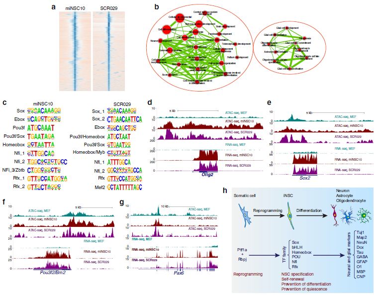 miNSC10 iNSC和SCR029 NSC的ATAC-seq結(jié)果表明,peak關(guān)聯(lián)基因富集在神經(jīng)發(fā)生、神經(jīng)元發(fā)育、大腦發(fā)育、膠質(zhì)細胞發(fā)育(圖8a, b),與NSC特征一致。在peak峰值中心300 bp窗口中鑒定新motif,說明miNSC10和SCR029細胞都富集了類似的屬于多個TF家族的TF結(jié)合motif,TF家族包括Sox、bHLH (Ebox)、Pou3f、homeobox、Nfi和Rfx(圖8c)。相應(yīng)地,RNA-seq數(shù)據(jù)顯示,與MEF相比,這些TF基因家族的多個成員在miNSC10和SCR029細胞中上調(diào)或高表達。qRT-PCR證明,除了Sox2之外,Sox5、6、8、21在miNSC10和SCR029細胞中均表達上調(diào)。一般來說,miNSC10細胞的ATAC-seq圖譜與SCR029細胞相似,但與MEF完全不同;而對于上調(diào)的TF基因,如Olig2(bHLH)、Sox2、Pou3f2/Brn2、Pax6 (homeobox),與MEF相比,miNSC10和SCR029細胞中這些位點具有更多的峰和/或差異峰(圖8d-g),說明更開放的染色質(zhì)結(jié)構(gòu)增加了基因表達。