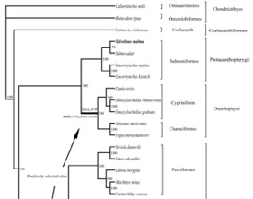 為了探究S.m-C4和S.m-TLR5免疫基因在魚類體內(nèi)的系統(tǒng)發(fā)育情況,中國淡水花羔紅點鮭與另外23條硬骨魚、兩條鯊魚和一條腔棘魚用于C4基因研究。重建貝葉斯系統(tǒng)發(fā)育中,四種鮭魚形魚類組合在一起,具有較高的后驗概率(PP)(圖7)。同時三種鯉形目魚類和兩種鰓形目魚類分別用1.00 PP進行分組,形成骨鰾總目分支。這一結(jié)果與傳統(tǒng)分類學和系統(tǒng)發(fā)育相一致。硬骨魚分為鰓形目、原鰓形目、鰓形目和棘鰓目四支,其中,兩條鯊魚是外群。