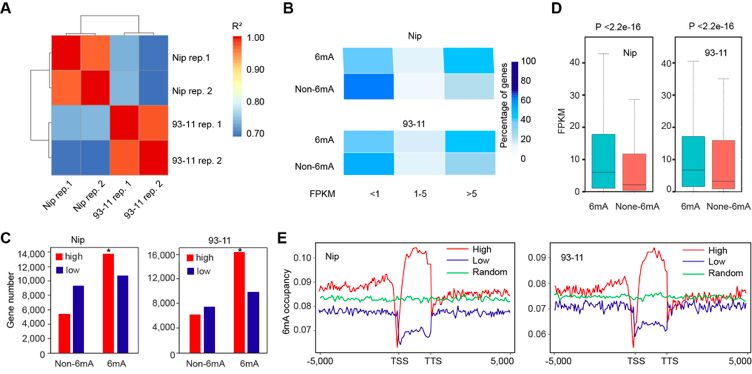 RNA-seq分析表明在Nip和93-11中,在6mA位點(diǎn)有大量的高表達(dá)基因甲基化,大量未甲基化基因在低水平表達(dá)。6mA甲基化基因的表達(dá)水平顯著高于非6mA基因,并且高表達(dá)基因顯示出較高的6mA占用率,特別是在啟動(dòng)子和基因體區(qū)域中包含6mA位點(diǎn)的基因。6mA與水稻中的活性表達(dá)基因有關(guān)。5mC在水稻基因組中高豐度存在,影響基因表達(dá),研究發(fā)現(xiàn)5mC和6mA之間沒(méi)有相關(guān)性(圖4)。