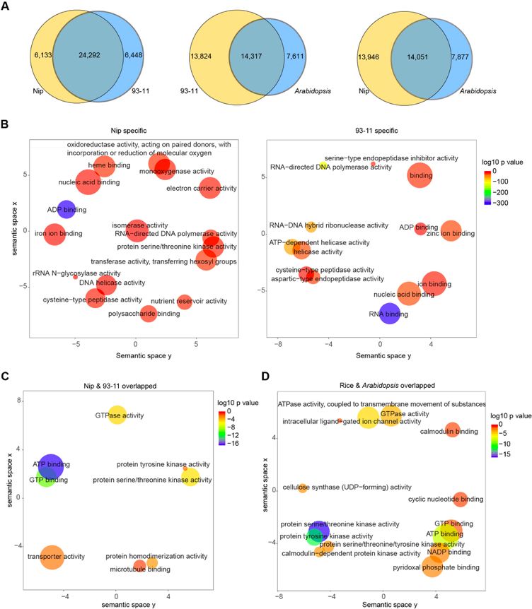 ? ? ??水稻Nip、93-11和擬南芥中6mA分布模式有幾個(gè)關(guān)鍵特征:6mA位點(diǎn)廣泛分布于所有染色體上,在著絲粒周圍異染色質(zhì)區(qū)域相對(duì)富集;在水稻中鑒定的富集motif與擬南芥中的motif非常相似;在水稻和擬南芥中均觀察到6mA在外顯子富集;6mA與水稻和擬南芥中的活性表達(dá)基因相關(guān)。在Nip,93-11和擬南芥中6mA甲基化同源基因比較發(fā)現(xiàn):大約80%的6mA甲基化基因在Nip和93-11之間重疊,大約一半的水稻(Nip或93-11)的6mA甲基化基因與擬南芥的6mA甲基化基因的三分之二重疊。GO分析表明6mA參與不同生物體中的許多不同功能(圖5)。