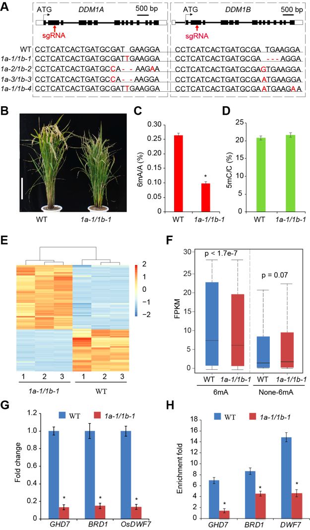 6mA-IP-qPCR證實(shí)了野生型植物SMRT測(cè)序鑒定的6mA位點(diǎn),1a-1/1b-1植物中6mA水平顯著降低。結(jié)果表明,抽穗期7(GHD7)、BR-缺陷矮稈1(BRD1)和DWF7的表達(dá)水平與其DDMa介導(dǎo)的6mA修飾相關(guān)(圖7)。