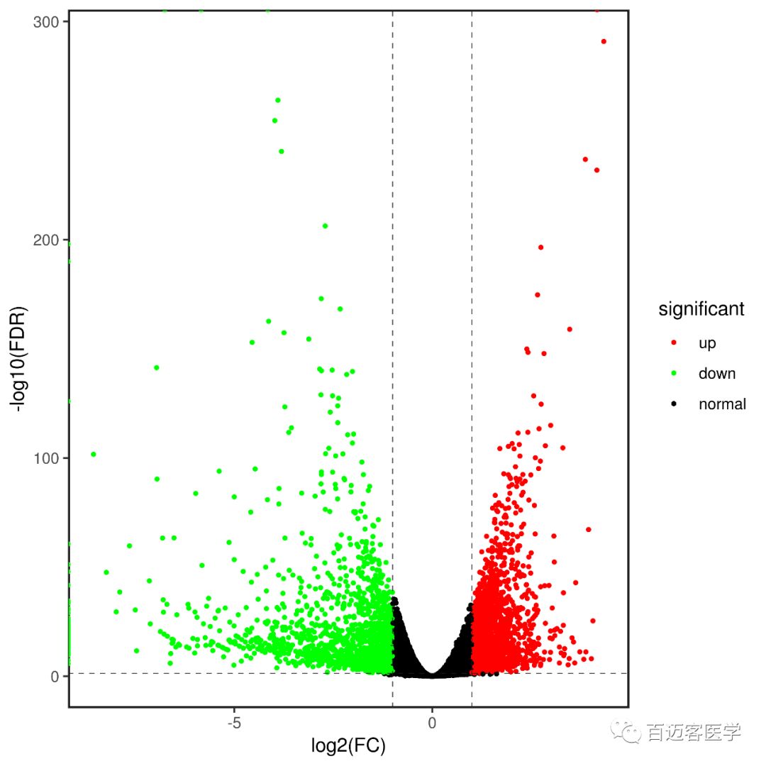 最后繪制出來的火山圖如下,是不是比干巴巴地在文章里面貼一個差異表達(dá)分析結(jié)果的表格好看多了?