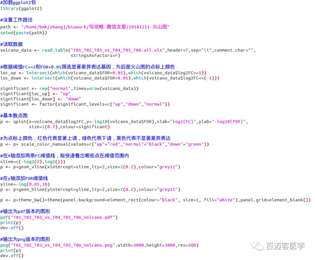 一般差異表達(dá)分析中會同時控制這兩個參數(shù)來篩選顯著差異表達(dá)基因,如取FDR<0.05和FC≧2?;鹕綀D可以直觀地展現(xiàn)所有基因的FDR與Fold Change之間的關(guān)系,以便快速查看基因在兩組樣品間表達(dá)水平的差異程度和其統(tǒng)計學(xué)顯著性?;鹕綀D的本質(zhì)其實(shí)就是散點(diǎn)圖。橫坐標(biāo)表示某一個基因在兩樣品中表達(dá)水平差異倍數(shù)的對數(shù)值,即log2(FC);橫坐標(biāo)絕對值越大,說明基因表達(dá)量在兩樣品間的倍數(shù)差異越大??v坐標(biāo)表示FDR的負(fù)對數(shù)值,即-log10(FDR)。縱坐標(biāo)值越大,表明差異表達(dá)越顯著,篩選得到的差異表達(dá)基因越可靠。下面,小編就手把手教你如何繪制火山圖啦。
