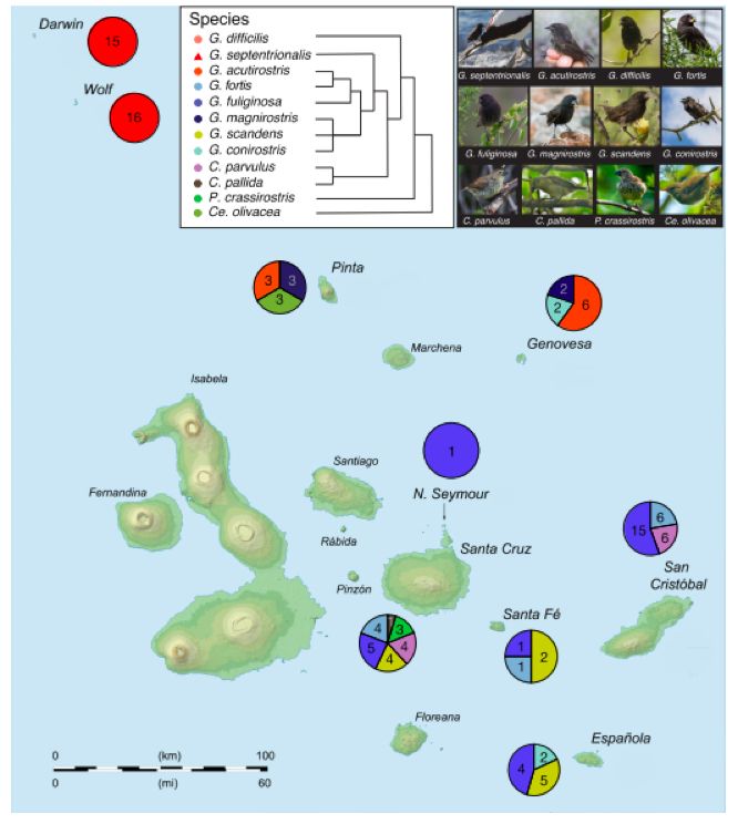 餅狀圖:不同島嶼上每種達(dá)爾文雀糞便樣本的數(shù)量;系統(tǒng)發(fā)育樹狀圖:目標(biāo)達(dá)爾文雀的進(jìn)化關(guān)系。