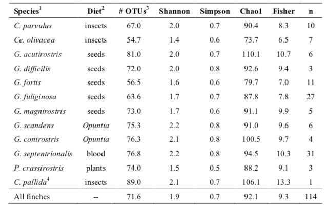 采樣:9個(gè)地緣隔離島,12種達(dá)爾文雀,114個(gè)糞便樣本,2個(gè)季度(旱季+雨季)。