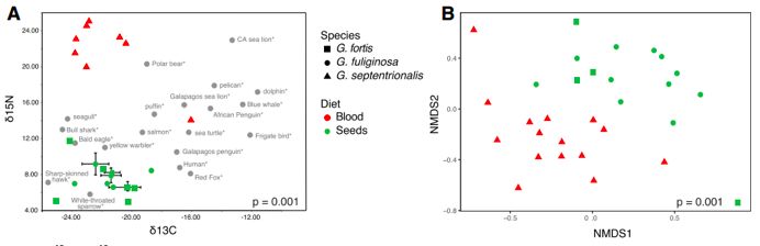 圖3. A:同位素δ15N?和?δ13C研究wolf與San Cristóba島上嗜血達(dá)爾文雀(Geospizaseptentrionalis)、小地雀(G. fortis)和中地雀(G.fuliginosa)食性,3者分別以紅三角、綠方形和綠圓形表示,其他動(dòng)物(人類、狐貍和海鷗等)以灰圓形表示(來(lái)源于公開(kāi)數(shù)據(jù));B:基于OUT的非度量多維尺度(NMDS)。不同食性(嗜血、食種子)的3種達(dá)爾文雀腸道微生物β多樣性。