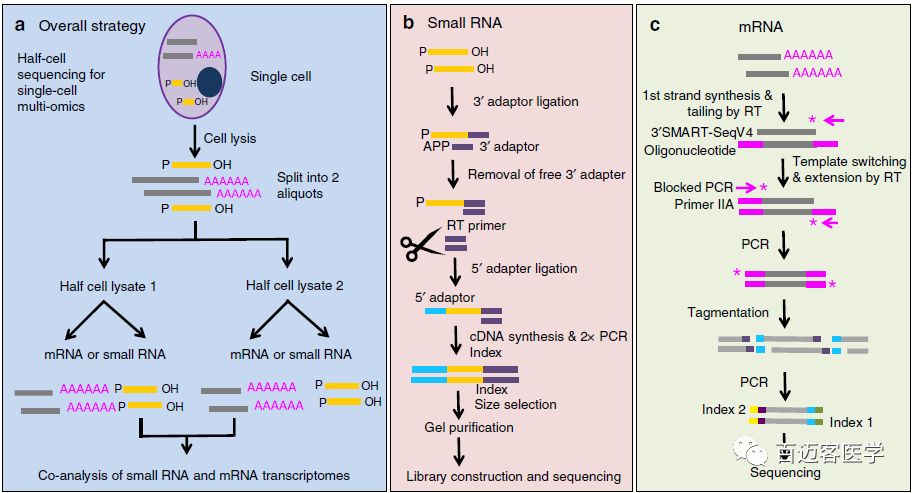 a 基于半細胞的單細胞miRNA-mRNA共測序的實驗流程; b 單獨的scmiRNA-seq流程;c 單獨的scRNA-seq流程