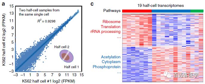 1、作者首先分別比較了來自同一細胞的半細胞單細胞microRNA測序和單細胞轉(zhuǎn)錄組測序之間的差異:該方法表現(xiàn)出良好的穩(wěn)健性(~95%成功率)和重現(xiàn)性(microRNA和mRNA的R2=0.93),產(chǎn)生可獨立驗證的成對半細胞microRNA和mRNA表達譜。