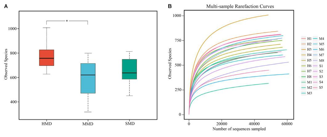 1、結(jié)果16S-rRNA基因測序結(jié)果分析從8個HMD,8個MMD和5個SMD糞便樣品中獲得總共1,165,731個高質(zhì)量序列,并且從每個樣品獲得48,489-61,048個分析序列(平均長度= 406.3bp)。HMD,MMD和SMD中觀察到的物種(OTU)顯示在圖1A中,每個樣品的平均OTU數(shù)為675±160。本研究中檢測到的數(shù)量表明物種的數(shù)量隨著測序深度的增加而增加。稀釋曲線的末端隨著每個樣品的序列數(shù)量的增加而逐漸減少(圖1B)。得到的OTU在Silva數(shù)據(jù)庫中進(jìn)行比對注釋,最后得到的細(xì)菌主要分為16門,26類,43目,63科和160屬。結(jié)果表明,健康麝的腸道微生物具有較高的細(xì)菌多樣性,而腹瀉麝的細(xì)菌多樣性較低。因此,腸道微生物中細(xì)菌物種的豐富性和多樣性是“健康”的重要組成部分,它們在維持腸道微生態(tài)系統(tǒng)的動態(tài)平衡和確保正常生理功能方面有重要作用。
