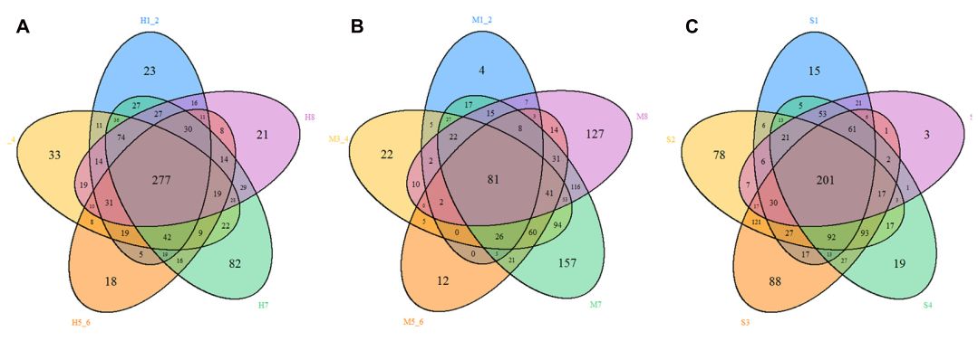 物種分類柱狀圖是表示HMD、MMD和SMD樣本中物種的組成及對應(yīng)物種在該樣本中的相對豐度。HMD、MMD和SMD樣本中在門水平和屬水平相對豐度前10的物種如圖5所示。無論是否存在腹瀉的樣本中,厚壁菌和擬桿菌都是主要的優(yōu)勢菌。然而,健康森林麝的糞便中厚壁菌的相對豐度明顯高于腹瀉麝。厚壁菌是構(gòu)成食物中纖維素分解代謝并將纖維素降解為宿主揮發(fā)性脂肪酸的主要細(xì)菌類型。此外,厚壁菌門還可以調(diào)節(jié)體內(nèi)免疫反應(yīng),抑制病原體的侵襲和預(yù)防腸道炎癥。腹瀉麝腸道中厚壁細(xì)胞豐度的減少可能會同時降低該物種的消化生理功能。另外,β多樣性的比較顯示,健康和腹瀉森林麝的細(xì)菌群落差異極顯著,這與麝的異常消化生理功能有關(guān)。HMD、MMD和SMD三組不同樣本之間共有OTU和特有OTU數(shù)量如圖6所示。