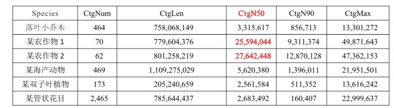 ContigN50是衡量基因組組裝好壞的一個(gè)重要指標(biāo),一定程度上來(lái)說,contigN50值越高表示組裝的質(zhì)量越好。組裝數(shù)據(jù)表中,ONT的組裝數(shù)據(jù)中contigN50水平均在1 Mb以上(測(cè)序深度的高低會(huì)有一定的影響,為了更好組裝指標(biāo),一般建議進(jìn)行100X以上),雜合度高的物種組裝結(jié)果同樣會(huì)略遜色于其它簡(jiǎn)單物種。相較之前最強(qiáng)水產(chǎn)組裝結(jié)果(N50>22 Mb),ONT作物組裝N50最高值再創(chuàng)新高,達(dá)到了27 Mb?。?span style="color: #3366ff;">數(shù)據(jù)評(píng)估結(jié)果點(diǎn)擊查看)不管大家怎么看,反正小編被如此高的指標(biāo)深深的震撼了,希望技術(shù)團(tuán)隊(duì)再接再厲,創(chuàng)造新的記錄!