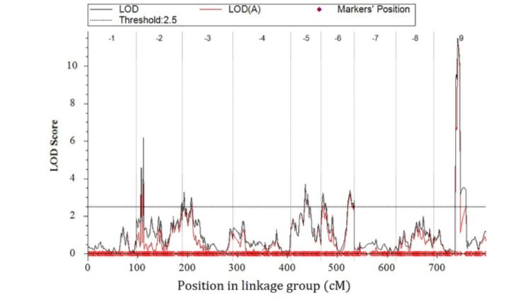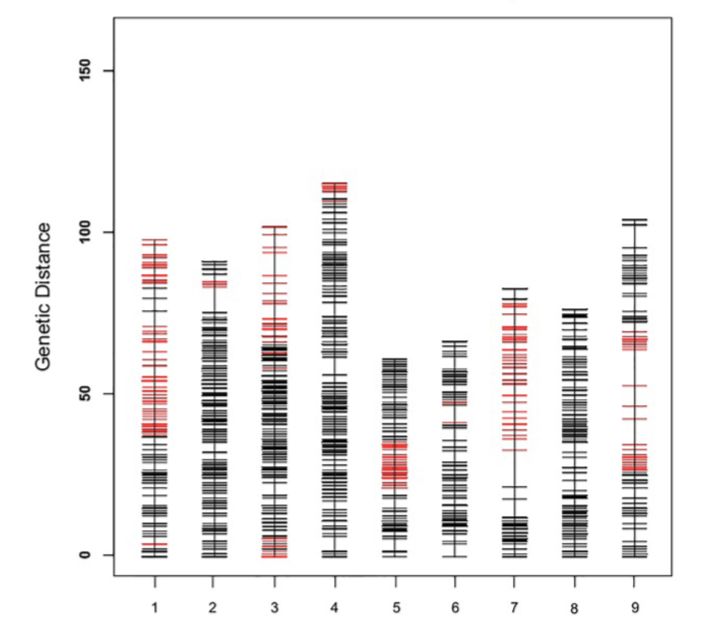 開發(fā)了185,349個SLAF標記,其中,20,250個SLAF標記可以成功分型,最終上圖的標記為4787個,分布于9個LG中,構建一張平均圖距為0.22cM的遺傳圖譜(如下圖),標記間最大gap超過10cM,這可能是由于小孢子培養(yǎng)構建DH群體的過程中,可能某種基因型更容易形成胚胎和再生植株,從而產(chǎn)生偏分離或某段染色體區(qū)域中無個體發(fā)生重組。