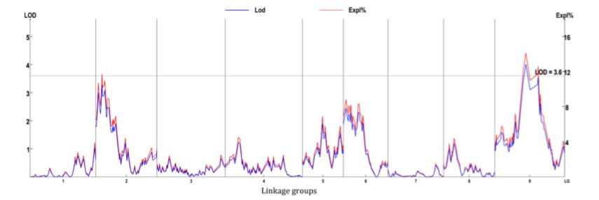 方法:SLAF測序,HighMap構建遺傳圖譜,IciMapping進行QTL定位,MapQTL進行BLUE分析及QTL定位