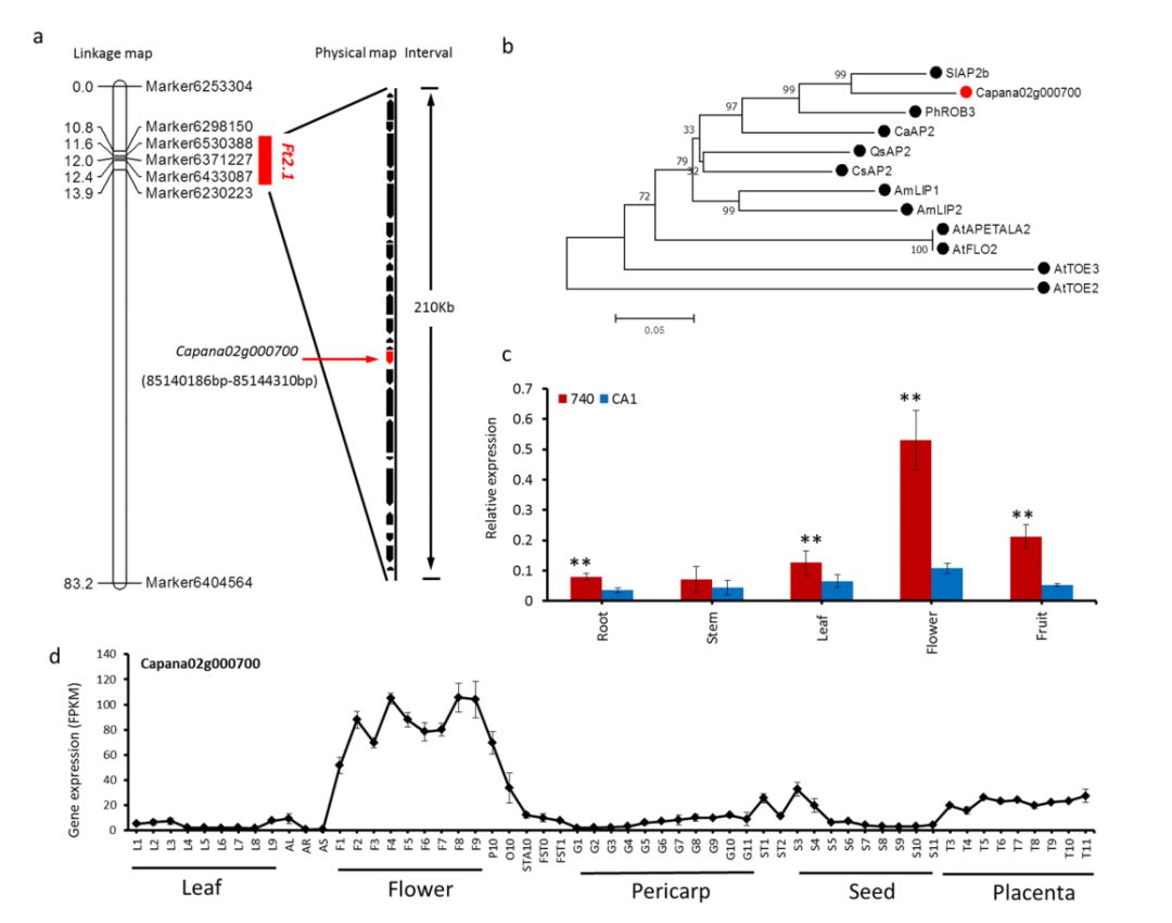 花期相關基因:針對主效QTL——Ft2.1進行重點分析,它處于遺傳圖譜上的區(qū)間為0.763cM,對應的Zunla-1基因組上物理區(qū)間為210Kb,包含25個基因,其中存在之前鑒定到的Capana02g000700基因,編碼花器官同源異型蛋白。進化分析表明Capana02g000700的同源基因,金魚草LIP1和LIP2、擬南芥APETALA2和辣椒CaAP2,均在花器官發(fā)育階段存在重要作用。同時,比對雙親間序列差異,發(fā)現(xiàn)8個SNP標記和1個6bp的InDel標記,這導致親本CA1存在2個氨基酸的缺失和5個氨基酸的改變。繼DNA層面分析之后,RNA層面的分析qRT-PCR和RNA-seq表明,這個基因在雙親間存在差異表達,且在花器官中表達量最高,最終認為Capana02g000700就是控制花期的候選基因。