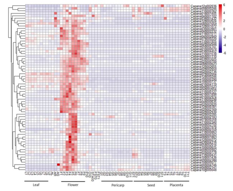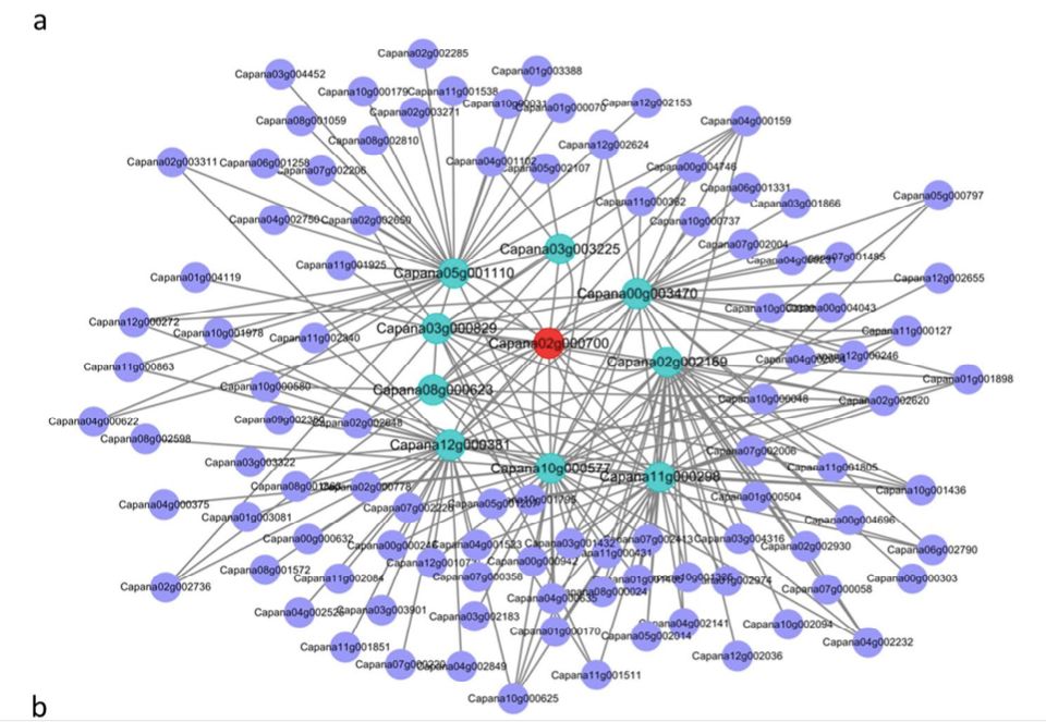 利用之前研究的不同發(fā)育階段和不同組織部的WGCNA分析結果,找到了花器官發(fā)育特定模塊,其中包含107個基因。這些基因中10個為TFs,其中就包含已鑒定的Capana02g000700,這表明這些TFs可能與花發(fā)育的轉錄調(diào)控相關。這107個基因中,發(fā)現(xiàn)9個基因與Capana02g000700高度共表達,分為3個家族,且其功能均與花發(fā)育相關。上述,均表明Capana02g000700通過抑制靶基因和/或TF表達來控制花器官發(fā)育,進而影響花期。