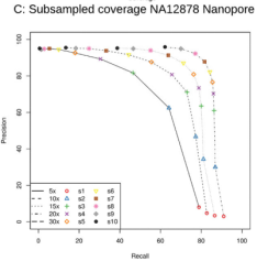 理想很豐滿、現(xiàn)實(shí)很骨感!理想情況下用10x覆蓋度測(cè)三代read就能檢測(cè)出來所有的結(jié)構(gòu)變異,但是現(xiàn)實(shí)肯定不夠啦~ 作者對(duì)真實(shí)的Pacbio 55X數(shù)據(jù),和Nanopore 28X數(shù)據(jù)所檢測(cè)到的SV和低深度下所檢測(cè)的SV進(jìn)行比較。對(duì)于Pacbio數(shù)據(jù),15X的時(shí)候?qū)τ贜A12878和SKBR3樣品的SV能識(shí)別到69.64%和67.24%,如果提升到30X時(shí),可分別識(shí)別到80.05%和76.63%。SKBR3的識(shí)別率相對(duì)較低主要因?yàn)樗前┌Y樣品,有些極端的拷貝擴(kuò)增。所以癌癥樣品要想識(shí)別到更多更準(zhǔn)的SV,需要適當(dāng)提升測(cè)序深度。