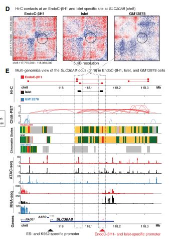 多組學(xué)分析結(jié)果在不同細(xì)胞中的比較。Hi-C互作表明在 EndoC-bH1 和人原代胰島SLC30A8位點有特異性loop,但在GM12878中缺乏。