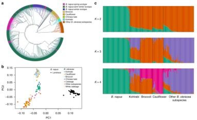 系統(tǒng)發(fā)育和群體結(jié)構(gòu)分析:分別利用BraA, BolC和Bna SNPs數(shù)據(jù)集獲得17,000, 19,377?和19,548個SNPs構(gòu)建3個ML trees(IQ-TREE v1.6.6),通過Bayesian information criterion(BIC)確定*佳模型,PCA主成分分析[EIGENSOFT version 6.1.4],群體結(jié)構(gòu)分析[ 50份B. napus地方種和2個祖先種,199份B. rapa和119?B. oleracea種質(zhì)材料(STRUCTURE)];