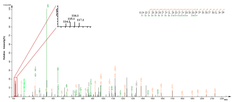 在質(zhì)譜圖中,任何一種iTRAQ試劑標(biāo)記的不同樣本中的同一蛋白質(zhì)表現(xiàn)為相同的質(zhì)荷比。在串聯(lián)質(zhì)譜中,報(bào)告基團(tuán)、質(zhì)量平衡基團(tuán)和多肽反應(yīng)基團(tuán)之間的鍵斷裂,質(zhì)量平衡基團(tuán)丟失,帶不同同位素標(biāo)簽的同一多肽產(chǎn)生質(zhì)量為114,115,116和117Da(八標(biāo)為113、114、115、116、117、118、119和121 Da)的報(bào)告離子(Fig.3中紅色標(biāo)記),根據(jù)報(bào)告離子的豐度可獲得樣品間相同肽段的定量信息,再經(jīng)過(guò)軟件處理得到蛋白質(zhì)的定量信息。