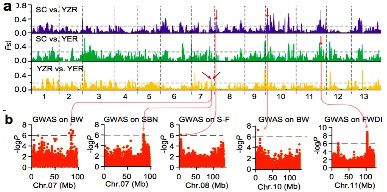 人工選擇在農(nóng)作物的馴化和遷徙的過程中具有重要的作用。群體結(jié)構(gòu)分析顯示當K=4時,YER與SC和YZR明顯不同(圖2b,K=4)。通過兩兩群體間的選擇性清除分析(FST)鑒定出了分別覆蓋到59,53和51個顯著遺傳分化的區(qū)域。SC和YZR之間的21個分化的區(qū)域(約43.5 Mb?含有915個基因)在群體SC和YER之間是保守的(圖3a)。對來自不同環(huán)境下的11個重要性狀進行全基因組關(guān)聯(lián)分析,在98個顯著關(guān)聯(lián)的信號中,其中25信號個來自基因區(qū)(外顯子或內(nèi)含子區(qū)),包含與形態(tài)性狀相關(guān)的8個信號區(qū),與產(chǎn)量性狀相關(guān)的6個信號區(qū),與油籽性狀相關(guān)的3個信號區(qū);剩余73個信號來自非編碼區(qū)。大部分農(nóng)藝性狀的GWAS關(guān)聯(lián)信號中顯示地理差異,如分支數(shù),開花期,鈴重和抗病性這些性狀定位在保守的基因區(qū)(圖4b)。