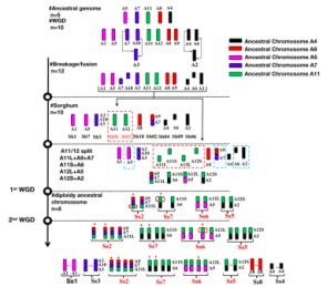 AP85-441基因組的組裝顯示了S. spontaneum的染色體數(shù)目從10降到8,而這與頻繁復制的古復制染色體對相關(guān),通過與高粱的聚類比對,發(fā)現(xiàn)高粱祖先5號染色體和8號染色體同源物經(jīng)歷了染色體裂變(見圖2)。SbChr05(A12)的祖先染色體斷裂分為兩個主要部分,即C5S(A12S)和C5L(A12L),分別轉(zhuǎn)移到SbChr06(A2)和SbChr07(A5)的祖先染色體;SbChr8(A11)的祖先染色體斷裂為兩個主要的部分,即C8S(A11S)和C8L(A11L),分別轉(zhuǎn)移到SbChr09(A6)和SbChr02(A7 + A9)的祖先染色體中。SbChr8和SsChr5之間及SbChr5和SsChr7之間近乎同源的短片段是在高粱與甘蔗分化前,高粱SSA形成于13.4 MYA同源基因的殘留物,同時發(fā)現(xiàn),S5中較小的SSA區(qū)域和S8中SSA的較大區(qū)域在重排的AP85-441基因組中也是保守的。