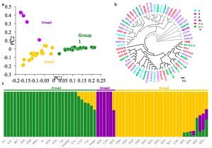 共計選擇了243份二倍體棉花材料:230份亞洲棉G. arboreum?(A2)?和13份草棉G. herbaceum?(A1),來自于中國南部(SC),長江(YZR)和黃河(YER)。以雷蒙德氏棉(G. raimondii)為外群,構(gòu)建系統(tǒng)發(fā)育樹顯示,G. herbaceum(草棉)和G. arboretum(亞洲棉)聚類成2個獨立的群(見圖2a和b)。G. arboretum(亞洲棉)進一步又分為SC,YZR和YER三個群,顯示了地理分布模式的差異,進而利用PCA分析支持這一結(jié)果(見圖2c)。