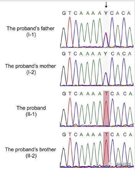 對(duì)兩兄弟及其父母進(jìn)行了全外顯子組測(cè)序WES,平均覆蓋深度為120×,目標(biāo)區(qū)域覆蓋度為99.87%。排除在任何變異數(shù)據(jù)庫(kù)中MAF>0.05的變異,錯(cuò)義突變、無義突變、移碼突變和剪接位點(diǎn)突變等優(yōu)先保留。此外,SIFT、PolyPhen-2和Mutation Taster等同時(shí)預(yù)測(cè)為具有潛在有害性的變異也被保留用于進(jìn)一步評(píng)估。