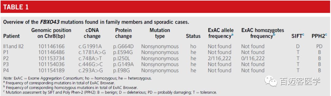 為了排除所鑒定的突變?cè)谘芯咳后w中是常見突變的可能性,對(duì)來自中國(guó)200個(gè)可育個(gè)體的FBXO43外顯子進(jìn)行了突變篩查。進(jìn)行精液分析和生育有后代的200名可育人群均為甘肅省漢族人。然而,在200個(gè)對(duì)照個(gè)體中沒有發(fā)現(xiàn)任何致病性FBXO43突變。