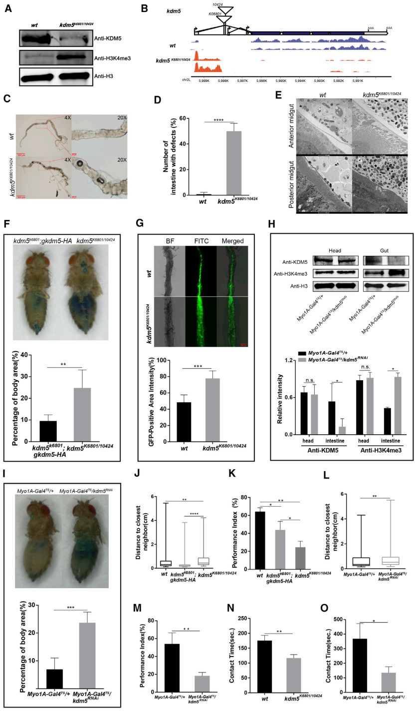?圖1. ?A:野生型(wt, w1118)和基因敲除型(kdm5K6801/10424)果蠅的KDM5, H3K4me3和組蛋白H3水平(Western blot);B:wtkdm5K6801/10424果蠅腸道組織KDM5轉(zhuǎn)錄水平(RNA-seq);C:wtkdm5K6801/10424果蠅消化道影像,紅框內(nèi)的斑點(diǎn)指示有腸道缺陷(氣泡);D:3-5齡wtkdm5K6801/10424果蠅的腸道缺陷(氣泡)比例;E:透射電鏡觀察wtkdm5K6801/10424果蠅前、后中腸上皮屏障;F:藍(lán)色食用染料標(biāo)記、測量wtkdm5K6801/10424果蠅的腸滲透性;G:異硫氰酸熒光素(FITC)標(biāo)記的玻璃粉指示kdm5K6801/10424果蠅消化道滲透性較高;H:Myo1A-Gal4 TS/+Myo1A-Gal4 TS/kdm5RNAi果蠅的頭、腸組織的KDM5, H3K4me3和組蛋白H3水平(Western blot);I:藍(lán)色食用染料標(biāo)記、測量Myo1A-Gal4TS/+Myo1A-Gal4 TS/kdm5RNAi果蠅的腸滲透性;J、K和N:與wt果蠅相比,kdm5K6801/10424果蠅的接觸距離變遠(yuǎn)、交往活躍度下降、雌性社交接觸時間變短;L、M和O:與Myo1A-Gal4 TS果蠅相比,Myo1A-Gal4 TS/kdm5RNAi果蠅也發(fā)生了接觸距離變遠(yuǎn)、社交活躍度下降、雌性交往接觸時間變短。