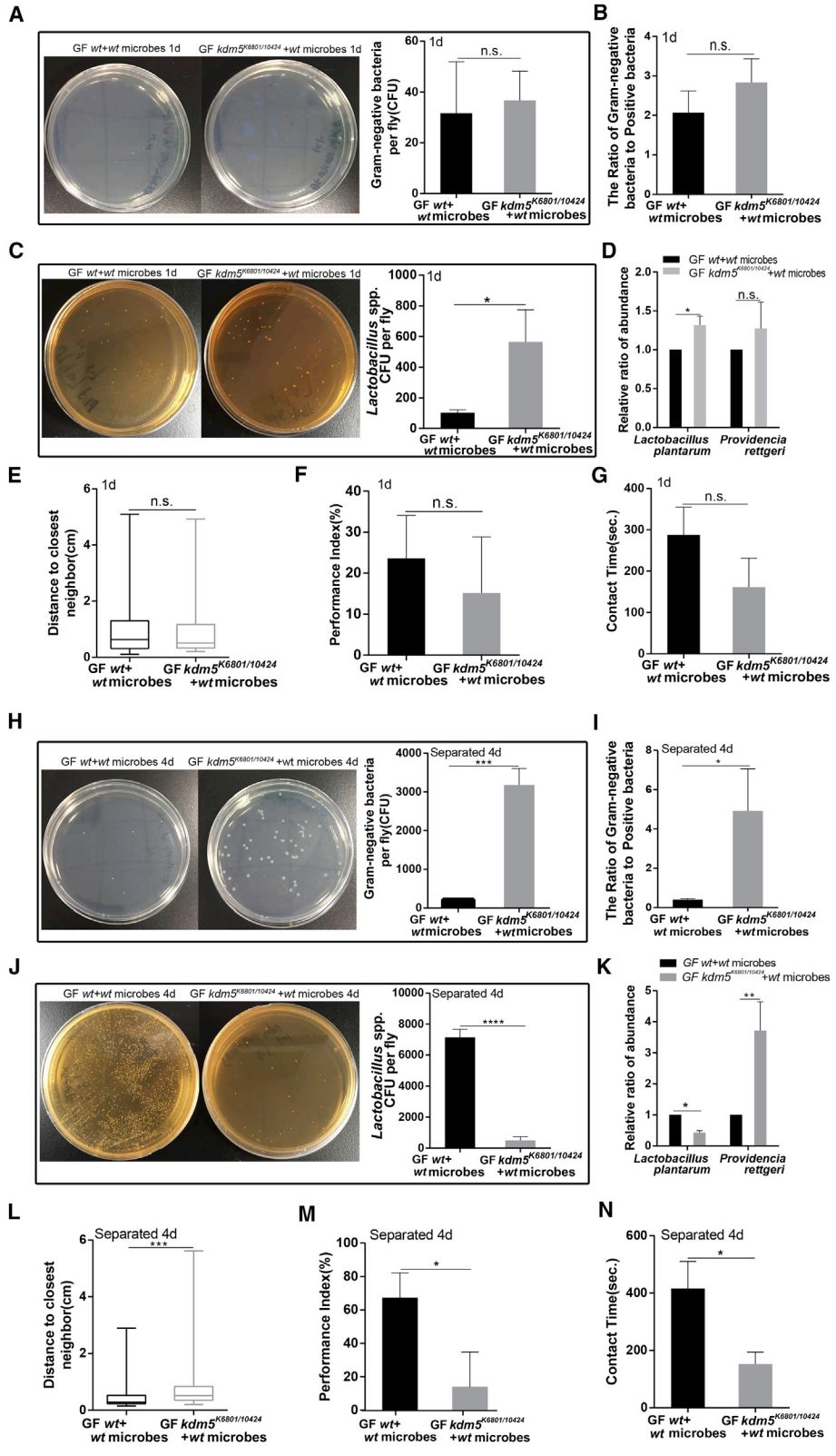 ?圖3. A-E:采用wt果蠅的菌群重塑后,1日齡無菌wtkdm5K6801/10424果蠅的腸道革蘭氏陰性菌數(shù)量(CFU/只)、乳酸菌(Lactobacillus spp.)數(shù)量(CFU/只)、革蘭氏陰性菌與陽性菌的比例、L. plantarum L168P. rettgeri P6相對豐度(RT-PCR)、接觸距離、社交活躍度、雌性交往接觸時間比較;F-N:采用wt果蠅的菌群重塑后,4日齡無菌wtkdm5K6801/10424果蠅的比較(同上述A-E)。